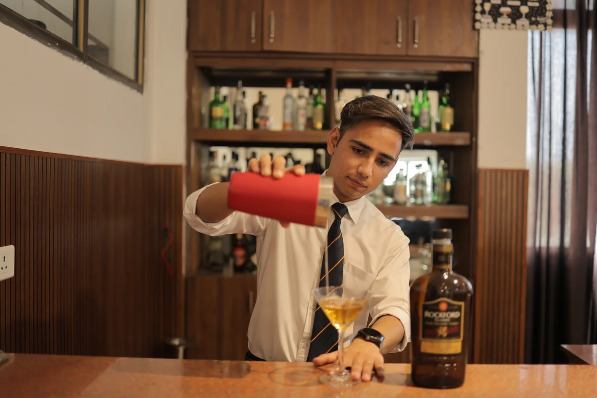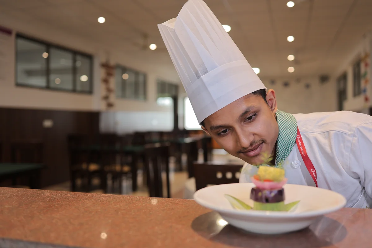 The Food & Beverage Service Lab is a practical training facility designed to teach students the art and techniques of serving food and beverages in a professional setting. It is equipped with dining tables, chairs, sideboards, trays, cutlery, crockery, glassware, bar counters, and mock restaurant setups.