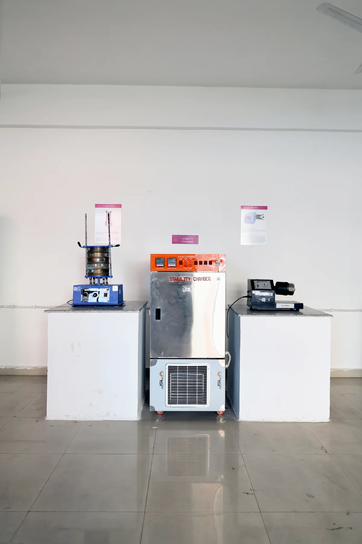 The Machine Room is equipped with advanced instruments and machinery for the manufacturing of tablets, liquid orals, capsules, parenterals, and ointments. It features a spacious setup with essential equipment, including a single-punch tablet machine, coating pan, dissolution and disintegration rate test apparatus, ampoule filling and sealing machine, bottle filling machine, sieve shaker, capsule filling machine, mechanical stirrer, double cone blender, tray dryer, and ointment filling machine. This laboratory provides aspiring pharmacists with hands-on experience in industrial manufacturing, preparing them for real-world pharmaceutical production and formulation.