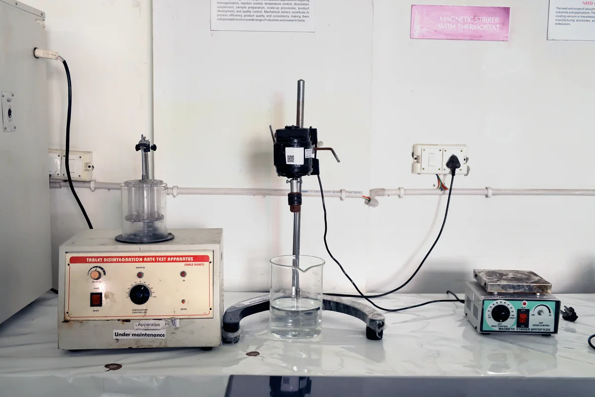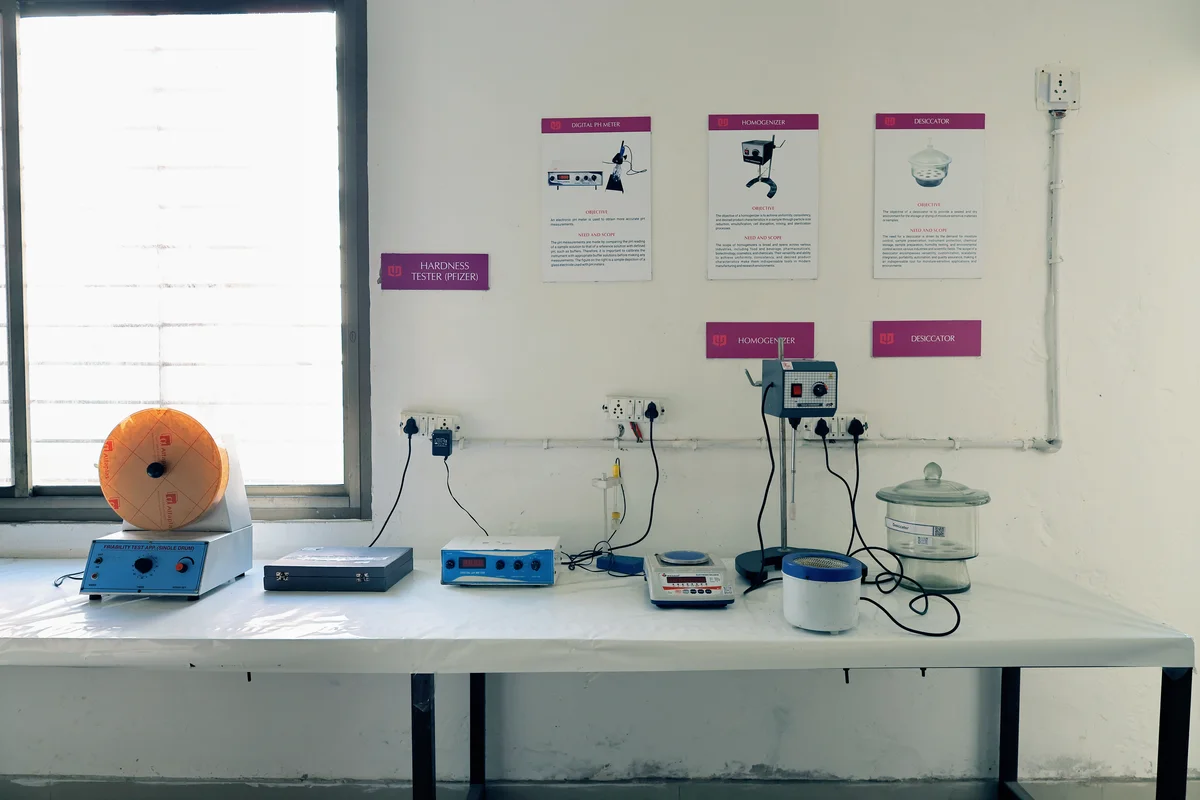 Pharmaceutics Laboratory-I is fully equipped with both fundamental and advanced instruments for the formulation of various dosage forms, including tablets, capsules, and elixirs. Students gain hands-on experience in evaluating formulations based on Pharmacopoeial standards, conducting tests such as weight variation, mechanical strength, disintegration, dissolution, friability, and parenteral clarity. This lab provides a simulated industrial environment, allowing students to develop essential skills and prepare for future roles in the pharmaceutical industry.